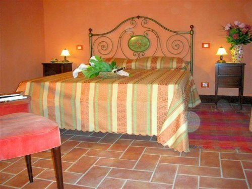 - La camera Biba è arredata in stile rustico con soffitto e travi a vista e pavimento in cotto.