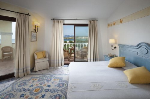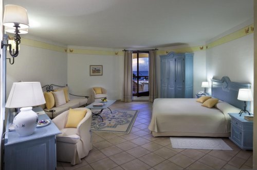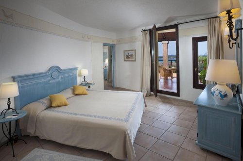 Las 170 habitaciones, la mayor parte con vistas al mar, son de típico estilo sardo, de colores cálidos y acogedores y disponen de aire acondicionado, TV en color vía satélite, SKY TV, línea telefónica directa, minibar, caja fuerte, balcón o patio, conexión a Internet y baño privado con secador de pelo.