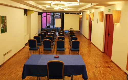 - sala grande, hasta 50 personas en platea, 35 en forma de herradura y 35 con bancos de escuela.