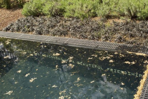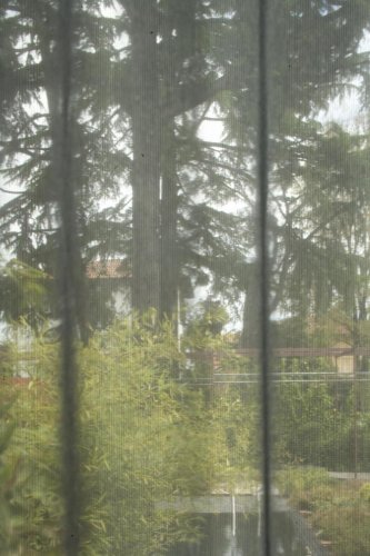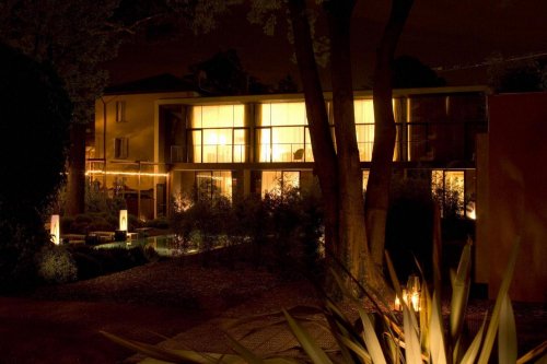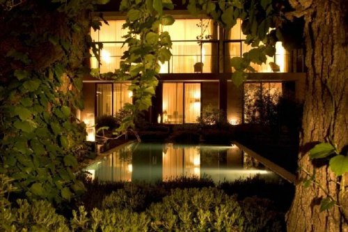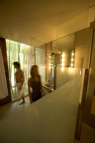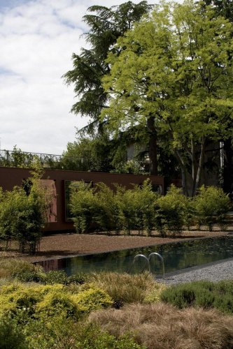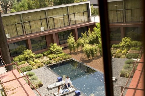 Las amplias cristaleras de las habitaciones ofrecen una maravillosa vista del jardín centenario interno, revisado en el estilo y los colores, y cuyas plantas se reflejan en el agua de la piscina.