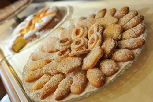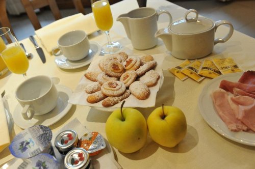 El bufé del desayuno ofrece una amplia variedad de tartas y galletas caseras, mantequilla y mermelada, cereales, yogurt, zumos de fruta, embutido y queso.