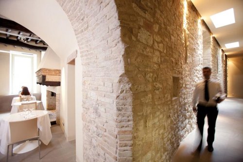 Los interiores se caracterizan por los techos con bóvedas de crucero y el equilibrio armónico entre historia y diseño contemporáneo. El chef propone los deliciosos platos de la tradición umbra realizados sólo y exclusivamente con grasas vegetales, cocinados a bajas temperaturas o al vapor.