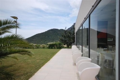 El restaurante se asoma a un jardín de césped inglés y dispone de amplios ventanales con unas estupendas vistas al mar y a las montañas.