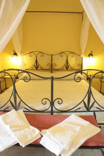 Cómodas y agradables, las habitaciones están amuebladas con camas de hierro forjado (algunas con dosel) y muebles de madera.