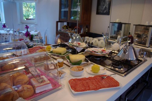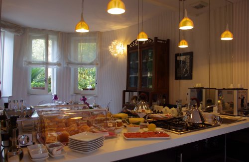 El desayuno se sirve en una sala de estar y en las terrazas con vistas al jardín.