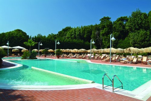 La hermosa piscina de agua dulce, rodeada de un patio de baldosas con mesas y sillas, permanece abierta en verano hasta por la tarde. Los clientes podrán relajarse dándose un chapuzón o en la acogedora carpa externa, mientras los niños se divierten en la zona de juego o en la simpática piscina exclusiva para ellos.
