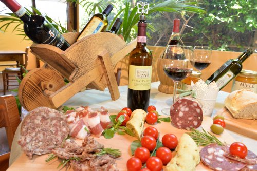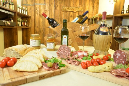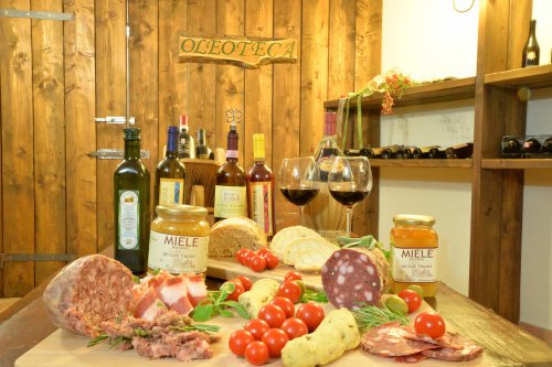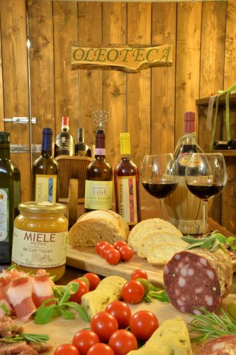 El restaurante, construido en piedra y madera, con suelos de baldosas, como indica la antigua tradición toscana, ofrece platos típicos del lugar utilizando materiales de primera calidad.