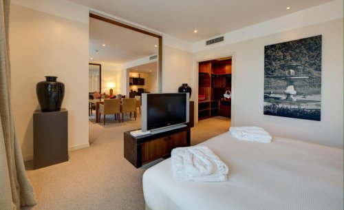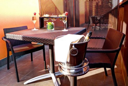 Las habitaciones dobles Deluxe de 70 m² están equipadas con pequeña cocina con microondas, 2 minibares, máquina de café con cápsulas, sala de estar con mesa de mármol y sillones de piel, un televisor en color LCD, sofás y espejos, dormitorio con cama King Size, escritorio, conexión Wi-Fi a Internet, baño privado con ducha y bañera.