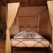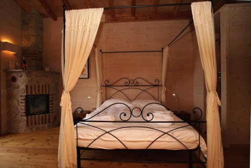 Habitación de matrimonio con cama con dosel, chimenea, lavabo de piedra hecho a mano, ducha y baño en la habitación. Dispone de acceso directo a la terraza con vistas a los viñedos y al mar.