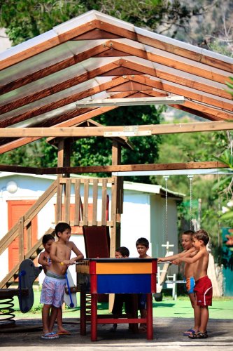 The resort also has a swimming pool with a spacious solarium, a common room with a television, a restaurant, a bar, a minimarket, and a games room with table tennis and foosball.