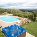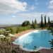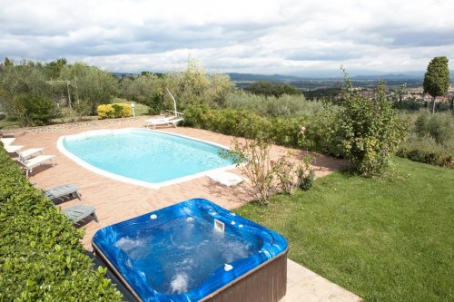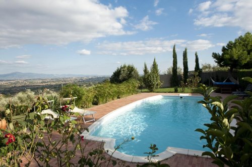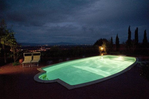 La espléndida piscina situada en un balcón natural disfruta de unas vistas espectaculares al monte San Savino, la Valdichiana y los Apeninos.