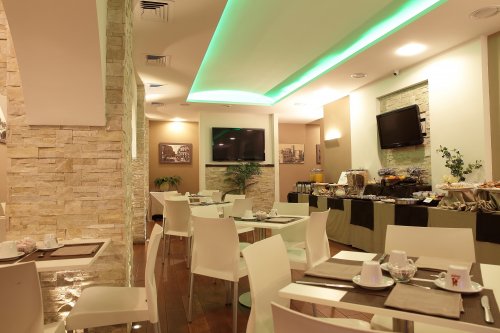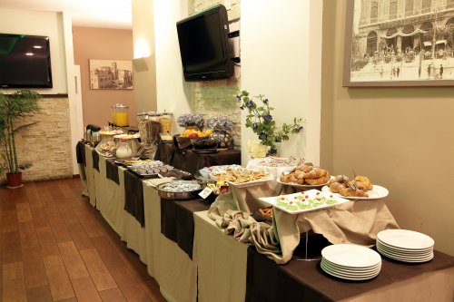 Le Bar de l'hôtel propose tous les matins un vaste assortiment de produits et de boissons pour le petit déjeuner servi sous forme de buffet. Le menu comprend: café express ou à l'américaine, thé, lait chaud et froid, chocolat, jus de fruit, croissants, biscuits typiques, crackers, confitures, biscottes, pain frais, tartes, yaourts, fruits de saison et fruits au sirop, charcuterie, fromages, céréales, oeufs durs.