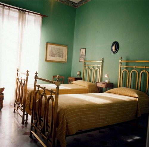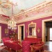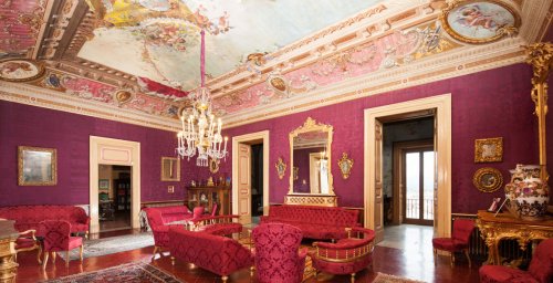 L'elegante sala Pompeiana con camino antico e pianoforte accoglie gli ospiti per la prima colazione.