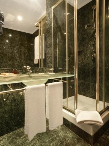 Les salles de bain en marbre vert sont dotées d'une douche et d'un lavabo en cristal, de toilettes, d'un bidet et d'un sèche-cheveux.