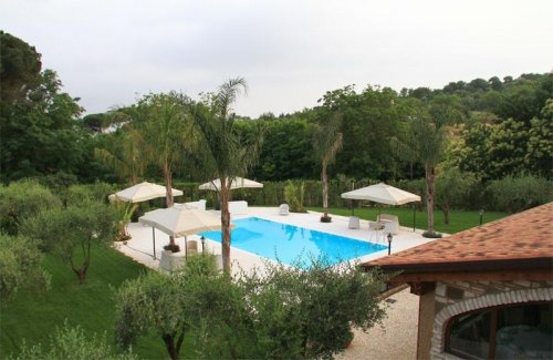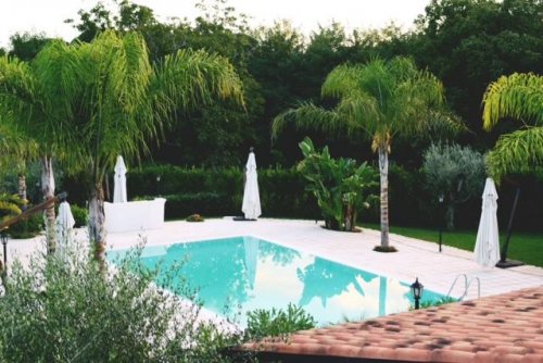 Il fresco giardino con alberi di carrubo e sugheri, ospita una magnifica piscina che fa da cornice ai ricevimenti all'aperto durante i mesi più caldi.