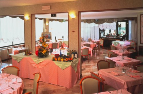 La salle-restaurant, située à l’intérieur de l’hôtel, avec baie vitrée et vue sur le lac, peut accueillir environ 100 personnes et peut aussi être aménagée pour recevoir les groupes souhaitant s’arrêter à l’hôtel uniquement pour déjeuner.