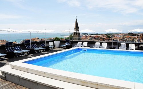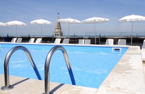 La magnifique terrasse panoramique située au septième étage est composée d'une superbe piscine, d'un solarium avec chaises longues et parasols, mais aussi d'un bar doté d'une TV avec chaînes privées (Sky) et réservé uniquement aux hôtes.