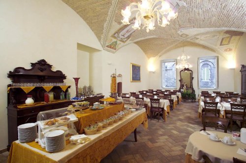 Le copieux petit-déjeuner est servi au buffet dans l'accueillante salle prévue à cet effet dotée de voûtes croisées. Il est composé de charcuterie, de fromages, de yaourts, de céréales, de plusieurs types de pains, de croissants, de confitures, de miel et de boissons chaudes.