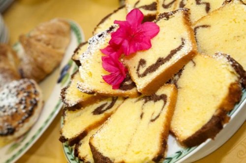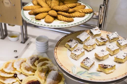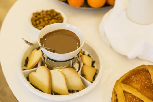 Un copieux petit-déjeuner est servi au buffet de 7 h 30 à 10 h dans la salle prévue à cet effet. Il est composé de boissons chaudes et froides, de jus de fruits, de croissants, de gâteaux faits maison, de biscuits, de yaourts, de céréales, de pain, de fruits frais, de confitures, de beurre, de pâte à tartiner, d'oeufs, de saucisses, de fromages et de charcuterie.