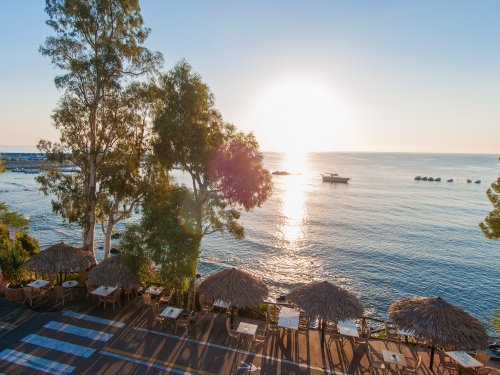La plage de l'hôtel située à 300 m de ce dernier est aménagée avec des parasols et des chaises longues.