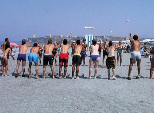 La plage est accessible par un passage souterrain. Elle comprend des parasols, des chaises longues, des transats, un terrain de volley de plage, des douches, des vestiaires et un espace dédié aux enfants.