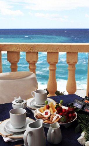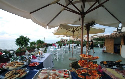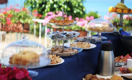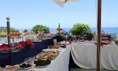 La colazione continentale con pietanze dolci e salate viene servita su una terrazza con una splendida vista sul Mar Tirreno.
