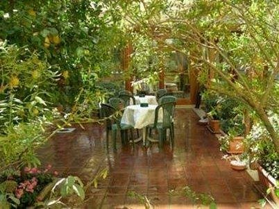La salle petit-déjeuner donne sur le jardin luxuriant où se trouvent des citronniers, des palmiers et des bananiers.