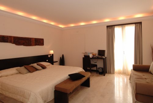 Les chambres de l'hôtel Ucciardhome sont riches de matériaux précieux, mobiliers de classe et jeux de couleurs suggestifs.