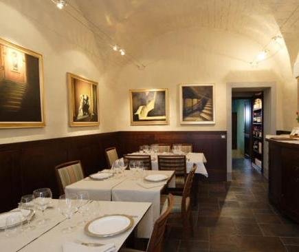 La cuisine ressemble à une ancienne épicerie, qui exalte quotidiennement les parfums et les saveurs d’antan. Le déjeuner et le dîner sont servis dans une salle accueillante, dans laquelle sont exposées certaines œuvres de Roberto Viani.