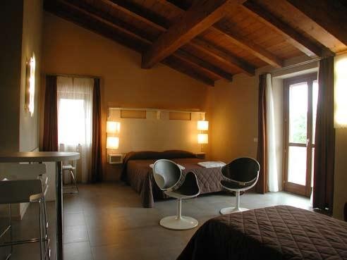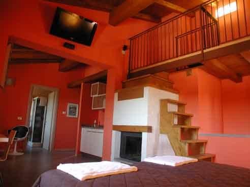 La Junior Suite Arancio est composée d'une mansarde avec un troisième lit, d'une grande salle de bain privée avec sèche-cheveux, du chauffage par le sol, d'une thermo cheminée en bois, d'une TV couleur avec numérique terrestre et d'une installation audio.