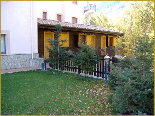 The adjacent buildings are cosy wooden chalets, ideal for romantic getaways.