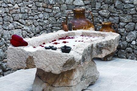 Le complexe hôtelier Quis Ut Deus est né de la restructuration d’une ancienne ferme de 1710, immergée dans le magnifique décor des oliviers millénaires des Pouilles.
