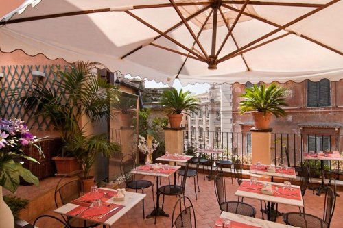 Le soir, il est possible de se détendre avec un délicieux cocktail ou un drink, en jouissant de la vue unique, de la terrasse située au troisième étage, sur la Fontaine de Trévi,