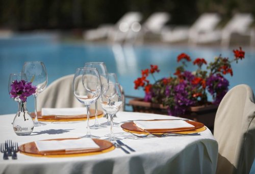 Le restaurant est situé aux bords de la piscine avec vue sur le parc.