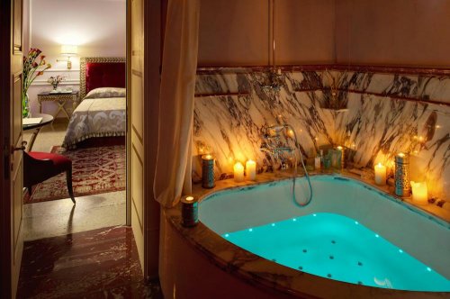 Uniche e prestigiose suites con sontuoso letto matrimoniale, elegante area salotto, ampio bagno in pregiato marmo, vasca idromassaggio con cromoterapia (31-48 mq).