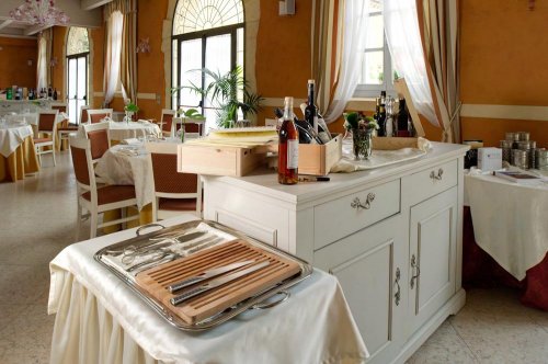 La struttura dispone di un ampia sala di 112 mq ca con vista sul giardino all'italiana, luminosa e in stile classico elegante, con rivestimenti in cotto e volti a vista, in armonia con la villa.