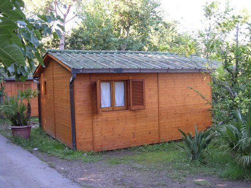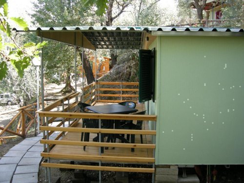 - Mobilhomes préfabriqués en bois composés d’une chambre avec grand lit double, d’une chambre avec lits superposés, d’une cuisine équipée d’un réfrigérateur et casserole et d’une salle de bain privée avec lavabo, toilette et douche.