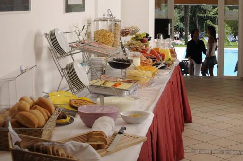 La ricca e gustosa prima colazione è servita con un buffet all'aperto durante la bella stagione.