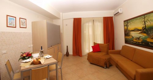 Completamente climatizzati, gli appartamenti sono dotati di angolo cottura a scomparsa attrezzato, frigorifero, balcone con vista mare frontale o laterale, doppi vetri, TV color satellitare, telefono, connessione Wi-Fi a Internet, portoncino blindato, lenzuola, coperte, asciugamani, cuscini, bagno privato con doccia.