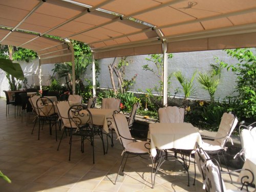 La prima colazione viene servita nella sala interna o nella splendida terrazza esterna adornata di piante.