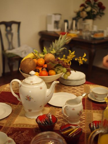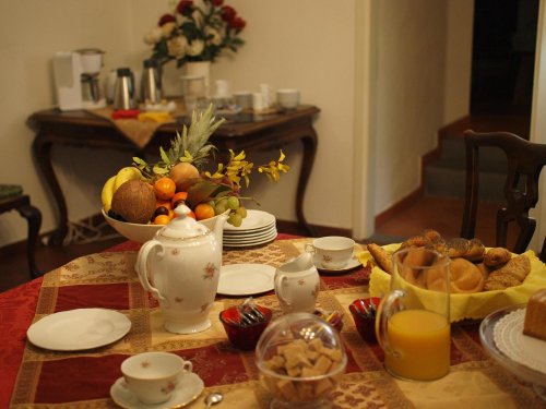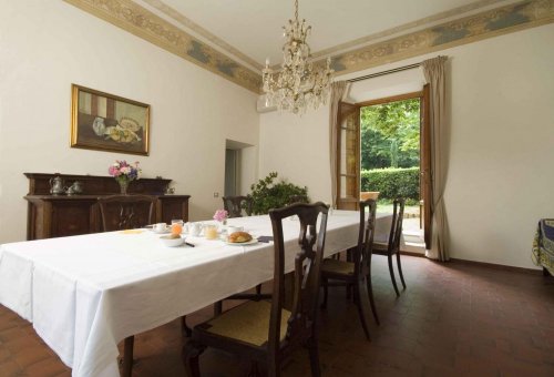 La ricca colazione continentale da gustare nel magnifico salone affrescato o, durante la bella stagione o nelle assolate giornate invernali, nel patio esterno con vista sul parco.