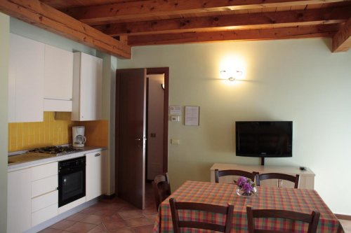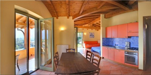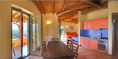 Il Trilocale, senza vista lago, dispone di un grande terrazzo, 2 camere matrimoniali di cui una con soppalco e divano letto, ampio soggiorno con cucina.
