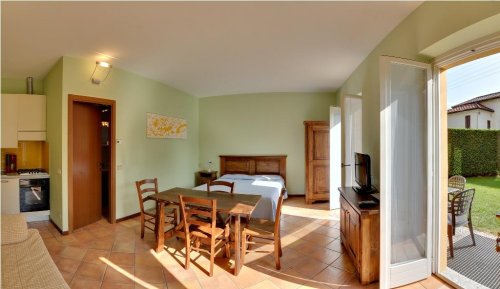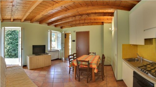 Il Bilocale, con vista lago, dispone di giardino privato e/o balcone, angolo cottura , soggiorno con divano letto, camera matrimoniale.