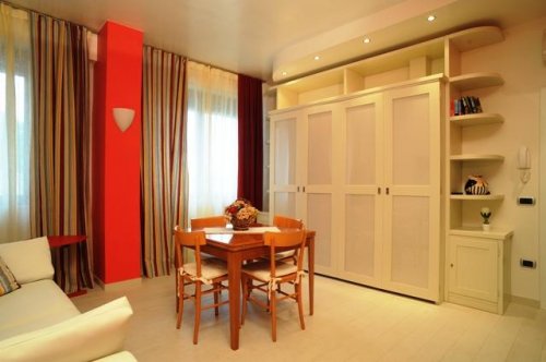 55 mq, si compone di un'ampia living-room con divano-letto, tavolo per il pranzo, vetrina con cassetti, una pratica e funzionale cucina a scomparsa con lavastoviglie, frigorifero, forno e fuochi completamente incassati, antibagno con lavatrice e asciuga biancheria, bagno con doccia e camera da letto con letto matrimoniale e letto singolo.