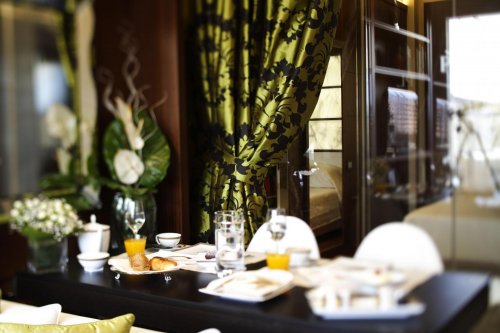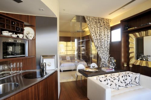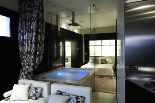 Gli interni si caratterizzano per lo stile contemporaneo: legni pregiati, marmi dalle sinuose venature, tendaggi di seta e doccia con cromoterapia, acqua nebulizzata e nebbia irlandese.