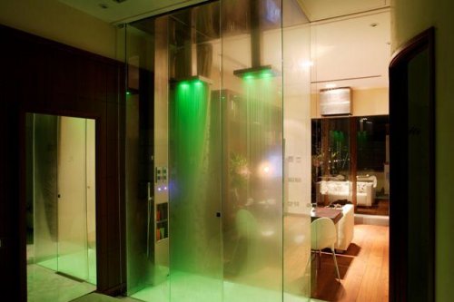 La camera da letto è separata dalla zona giorno da una doccia benessere doppia al centro dell'appartamento, con pareti di cristallo, cromoterapia e acqua nebulizzata per un momento di benessere unico.
