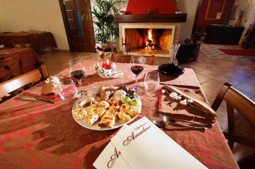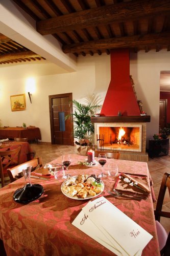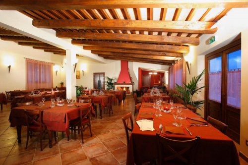 La prima colazione, il pranzo e la cena vengono servite nella sala ristorante con capienza massima di 100 persone e con soffitto a travi e cotto fatto a mano.