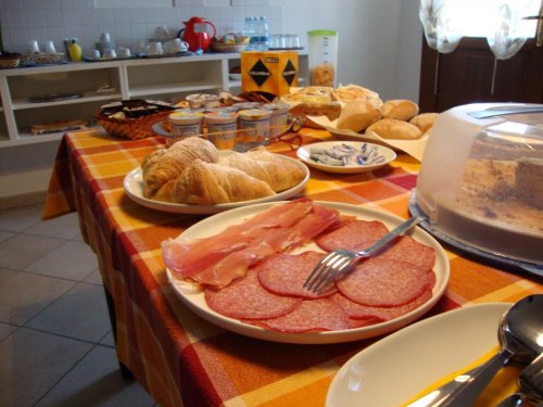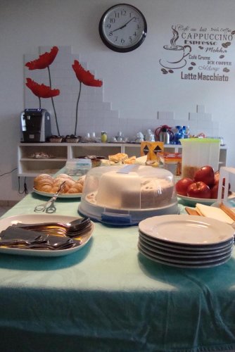 La prima colazione è servita a buffet nell'apposita sala, tutte le mattine, dalle ore 07:00 alle ore 09:00, e propone prodotti come latte, caffè, acqua calda per tisane, brioche appena sfornate, torte, frutta di stagione, cornflakes, yogurt.