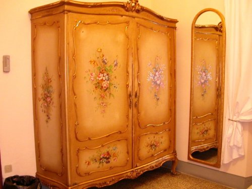 La Camera Fiorita è arredata in stile Veneziano, con un armadio color oro dipinto a mano e un piccolo balcone che si affaccia sul retro dell'albergo-