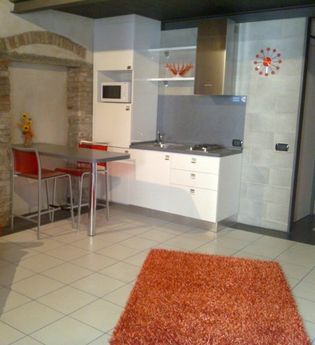 La zona giorno è composta da angolo cottura attrezzato, salotto con televisore e divano letto, il tutto arredato con gusto e attenzione nei particolari. Il bagno con doccia stile moderno, in cui domina il cristallo e l’acciaio, tutto in armonia con le pareti, con lavorazioni tipiche dell’epoca del palazzo e parti in pietra lavorate con intonaco a base di calce.